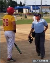 Lori Warne from Sioux Falls, S.D. explains a ruling to a men’s fast pitch player. Lori has been an USA Softball umpire for over 30 years and is retired from a career in education.