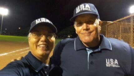 Region 10 I (L to R): Gina Fernandez, the Junior Olympic (JO) Umpire-in-Chief for USA Softball of Hawaii, and Hal Morgan with USA Softball of Nevada. |