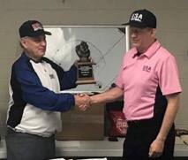 Ed Marx, Jr. from USA Softball of Michigan (pictured on right) receiving his National Indicator Fraternity Award from his District Umpire-in-Chief, Don Newsted. Ed has been umpiring for over 20 years and has been to three National Slow Pitch Tournaments and has umpired in numerous State Championships for USA Softball of Michigan.