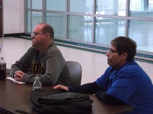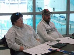 Region 7 I Toni Lewis and Jay Honohan from USA Softball of Iowa are deep in thought as they listen to John Orlowski talk at the USA Softball of Iowa Umpire clinics. |