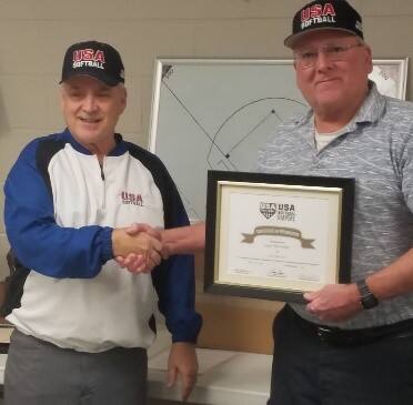 Region 6 | Larry “Lars” Schroeder, is seen here receiving his Gold Medals award. Schroeder is a veteran of more than 40 years umpiring softball for USA Softball of Michigan. He has umpired more than 13,000 games in the local recreational leagues around the Ann Arbor area. He is very passionate and dedicated in what he does on the field. Despite having double hip-surgery a few years ago, Lars has resumed a busy schedule of games built around his work for the City of Ann Arbor. |