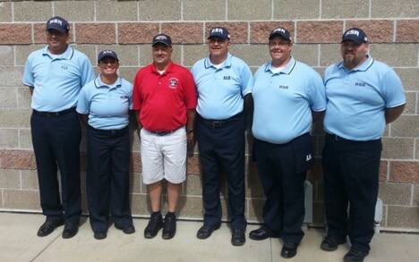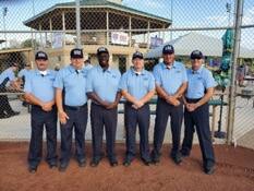 Region 7 | USA Softball of Nebraska Umpires at the Men’s Class E/Rec SP Northern National, in Topeka, KS. (L to R): Terry Weaver, Luke Derowitsch, Carlton Frazier, C.J. Cooper, Chris Clark, and Manny Motto. Nebraska State UIC, Tim Watts, has done a great job developing these men into some of the top Slow Pitch USA Softball Umpires in Region 7. |