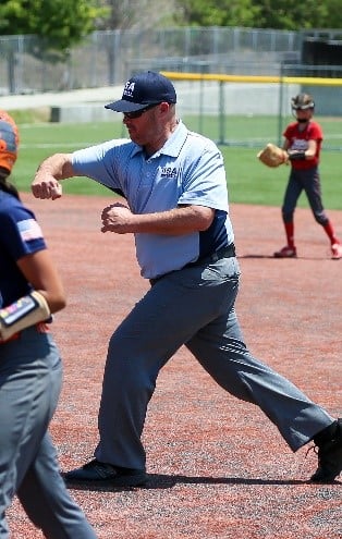 Region 8 | Paul Goebel is a USA Softball of Minnesota umpire from St. Cloud, Minn. Paul has officiated in both Fast Pitch and Slow Pitch National Championships. Here is Paul demonstrating great starting position with a runner on first base. |