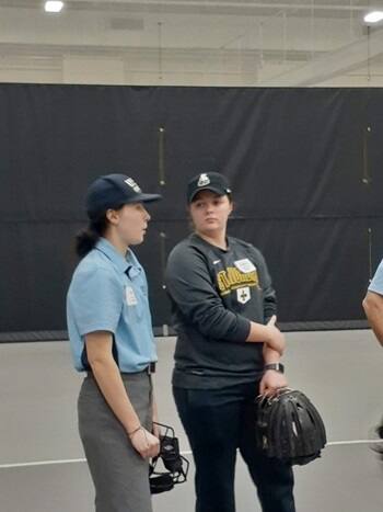 Region 8 | Marissa Maurer (left) graduated from Ellsworth High School with honors this year. Marissa has been a USA Softball of Wisconsin umpire four years. Meghan Gonnering (right) is a new umpire recruit for USA Softball of Wisconsin. Both attended the 2020 National Umpire School in Stevens Point, Wisconsin in February 2020. Here they are collaborating after taking a turn working on their behind the plate stance and skills. |