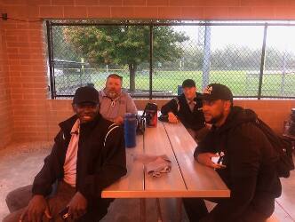 Region 7 | USA Softball of Kansas City umpires waiting out a rain delay at the Rawlings Fall Brawl tournament. Pictured from left to right: Dan Vice, Andy Seever, Derrick Williams, William Bundy. |