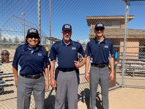 Region 9 | USA Softball of Wyoming 16-Under State Championship Crew. Left to Right: Pam Vallejos, Michael Showalter, Lucas Kluber First Base Umpire: Pam Vallejos, 31-year Elite Umpire who also worked the 18-Under GOLD Nationals. Home Plate Umpire: Michael Showalter, 24-year Elite Umpire, who also worked the 18-Under USA Softball Girls’ Fast Pitch Class A National Championship. Third Base Umpire: Lucas Kluber, 5-year umpire, working on his Elite, who also worked the 16-Under GOLD Nationals. This was the only championship game played in Wyoming in 2020 due to the COVID-19 restraints on playing.