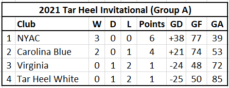 - Men (Group A): NYAC, Carolina Blue, Tar Heel White, Virginia