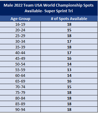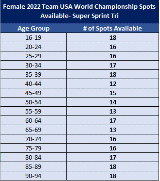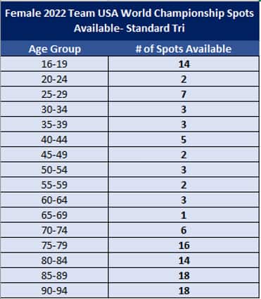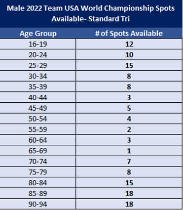 Qualifies for Standard Triathlon World Championships- Abu Dhabi, UAE- November 2022. Qualification: Due to the 2021 cancellation of Standard Tri Worlds, spots for 2022 are extremely limited, as Team USA 2020 athletes have first priority to 2022 Worlds. Below are the remaining number of spots per gender and age group that are available: