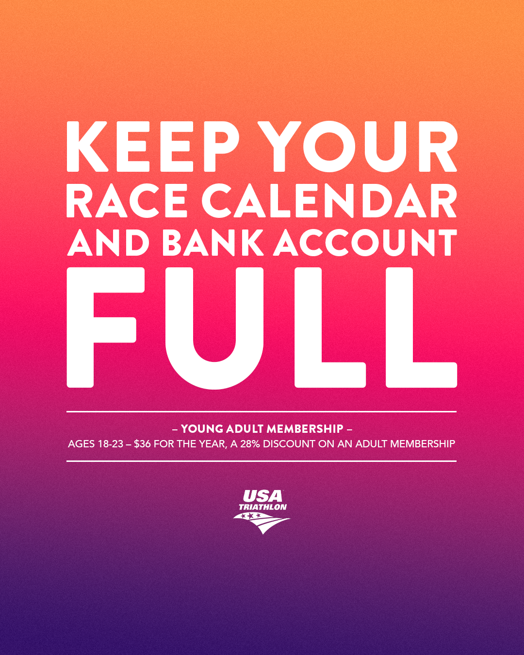 Athletes can purchase the Young Adult Membership through the USA Triathlon Membership Hub or on all event registration platforms.