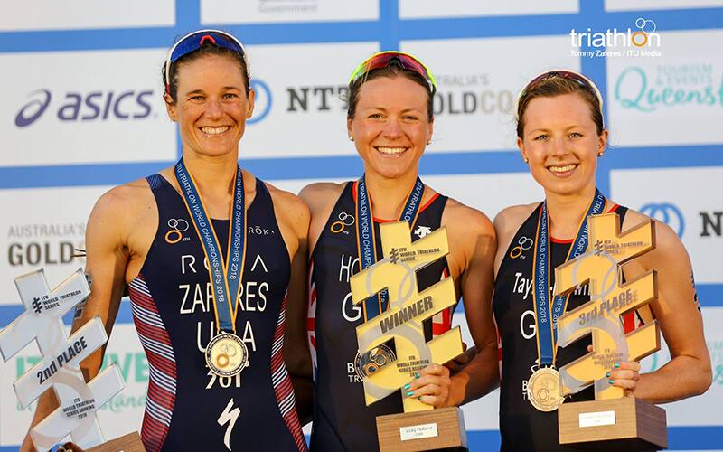 The 2018 ITU World Triathlon Series overall podium (L-R): Katie Zaferes (USA), silver; Vicky Holland (GBR), gold; Georgia Taylor-Brown (GBR), bronze.