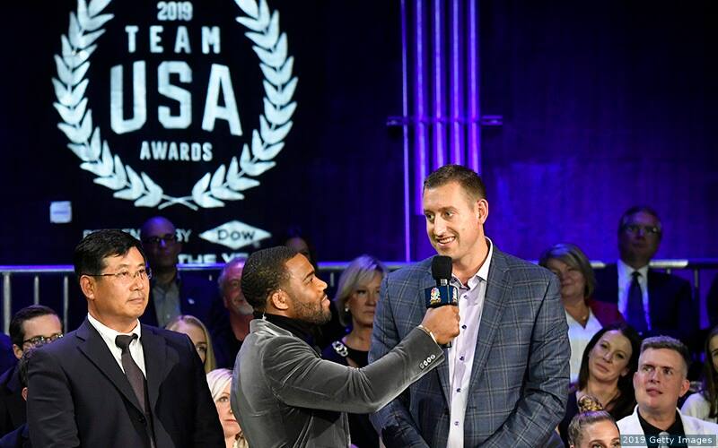 Host Jordan Burroughs, 2012 U.S. Olympic wrestling champion, interviews Wesley Johnson at the 2019 Team USA Awards Presented by Dow.