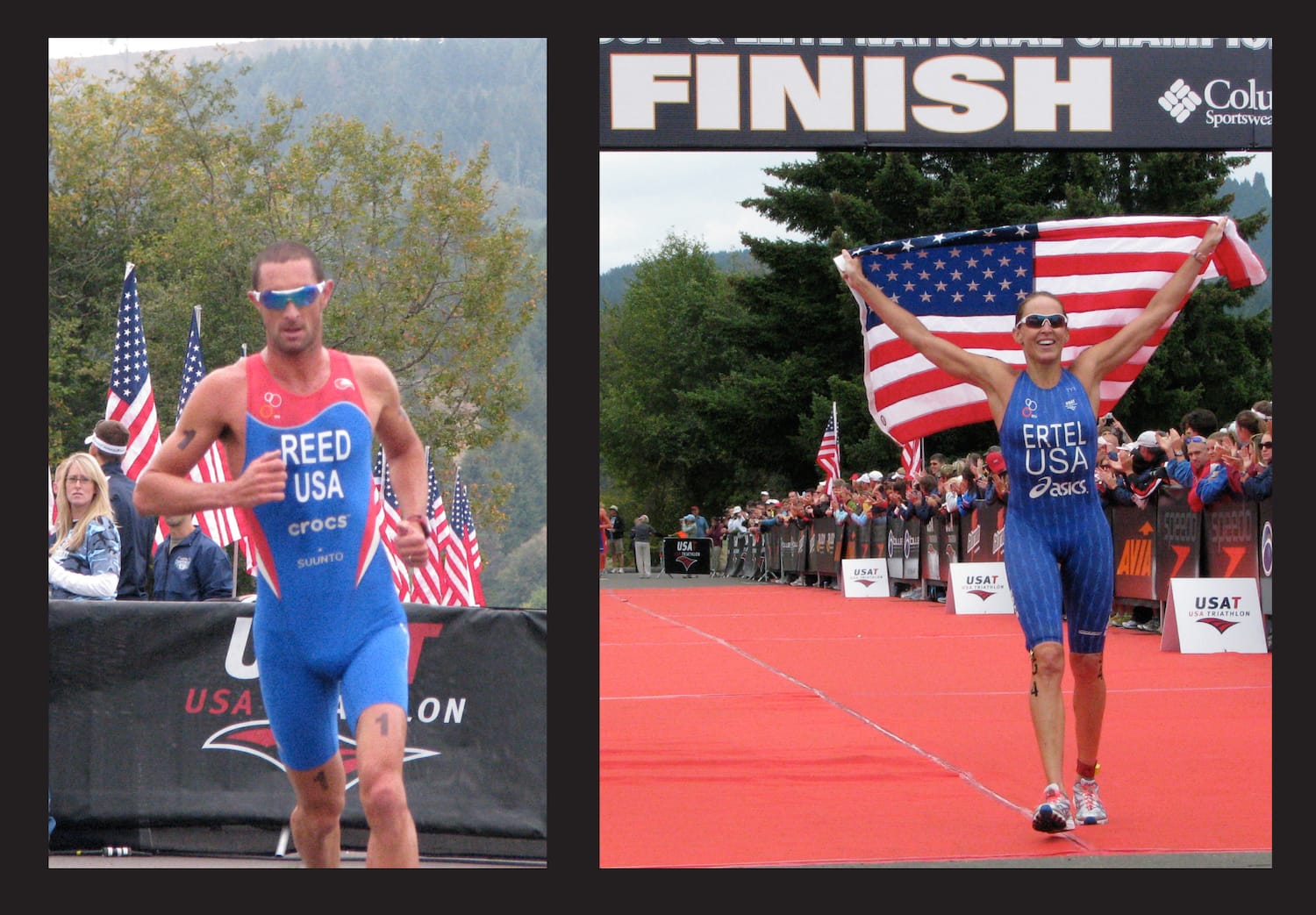 Matt Reed and Julie Ertel each used a strong run leg to pull away from the competition and win USA Triathlon Elite National titles at Hagg Lake, Ore., on Saturday.
