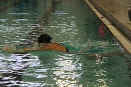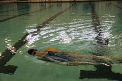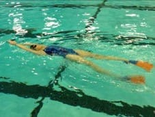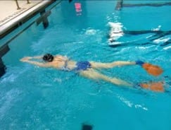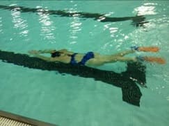 1. Kicking on Back: Hands and arms outstretched above the head. Focus on keeping the hips high in the water and your head in a neutral position. Relax your breathing.