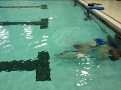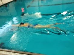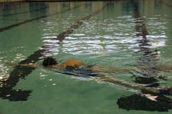 3. Kicking on back with rotation: This drill helps focus on good body position and working on your long axis rotation. In a horizontal position on the back with arms by the sides, rotate your body to the side 90 degrees. Hold the position momentarily (3-5 seconds) before rotating on to your back and on to the opposite side. Let the hips lead the rotation and focus on keeping the head in a neutral position. Take your time and relax the breathing.