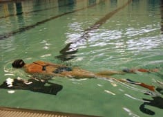 4. Underwater push-off wall: This drill helps you focus on being streamlined in the water. On your stomach, take a deep breath, bob under water and push hard off the wall. Staying underwater and with hands in an outstretched and torpedo position, kick until you need to come up for air before repeating the drill. Don’t hold your breath; rather, slowly let the air out through your nose and mouth.