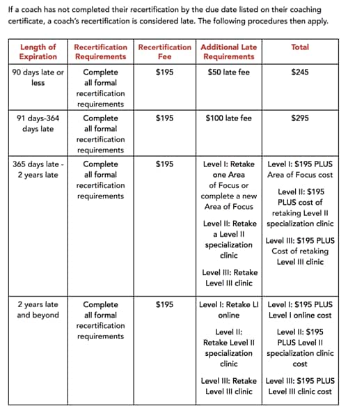 Effective 1/1/21, any coaches who earn their certification 1/1/21 or later must take an Area of Focus. For coaches who do not complete this during their two year recertification period, the price increases from $150 per course to a late fee of $199.