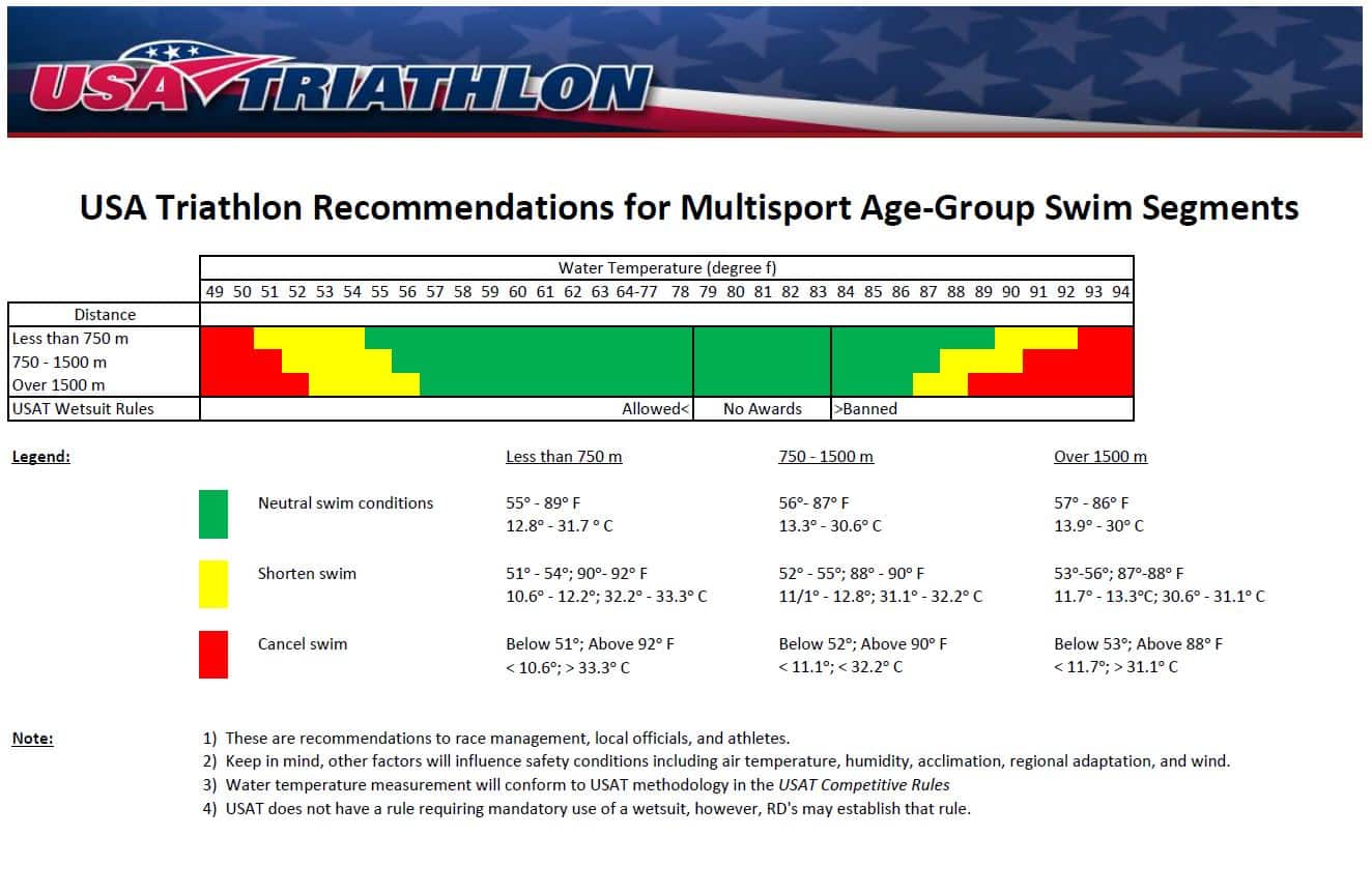 Race directors can also use the Water Temperature Guidelines as a guide in canceling or shortening the swim in sanctioned events. This chart has been designed to be used as a recommendation, not a requirement. Please download the chart here.