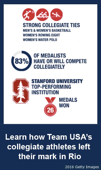 Collegiate athletes contributed to Team USA’s historic performance at the Olympic Games Rio 2016. Nearly 80 percent of the 2016 U.S. Olympic Team – and nearly 85 percent of Team USA medalists – had collegiate ties.