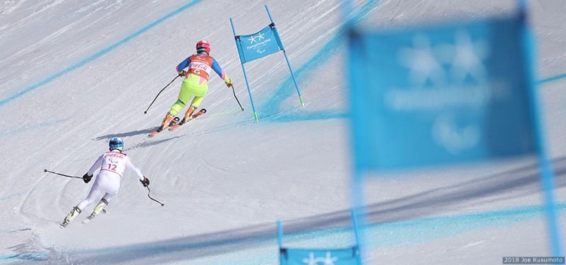 Mark Bathum (white) and Cade Yamamoto (green) compete at the PyeongChang 2018 Winter Paralympic Games.