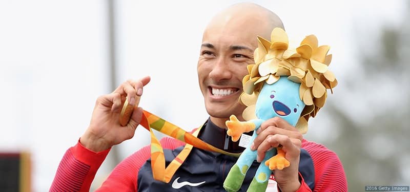 Will Groulx celebrates at a medal ceremony at the Rio 2016 Paralympic Games.