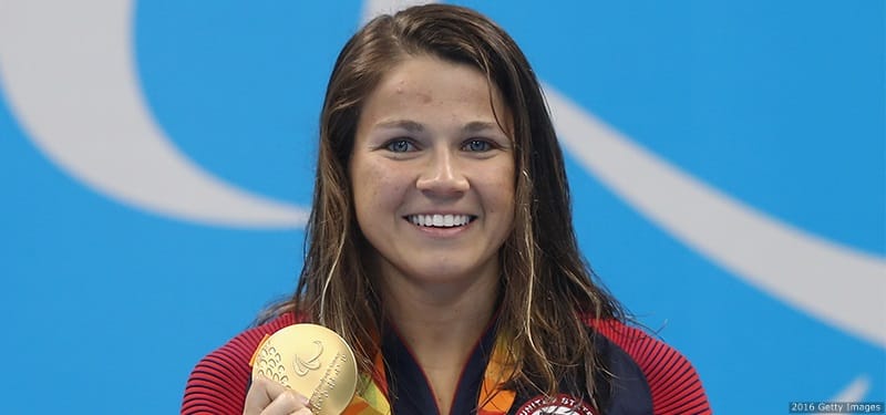 Becca Meyers poses after winning gold at the Rio 2016 Paralympic Games.