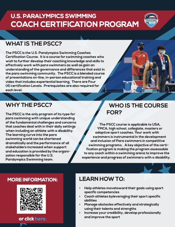 Is the PSCC Course applicable to USA, YMCA, High School, Collegiate, Masters or Adaptive Sport Coaches? YES! Your work with swimmers is instrumental in the development and inclusion of para-swimmers in competitive swimming programs. A key objective of the certification program is making the program assessable to any coach within a swimming arena to improve the experience and progress of swimmers with a disability.