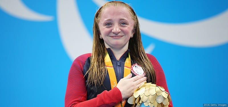 McKenzie Coan smiles during the National Anthem after winning gold at the Rio 2016 Paralympic Games.